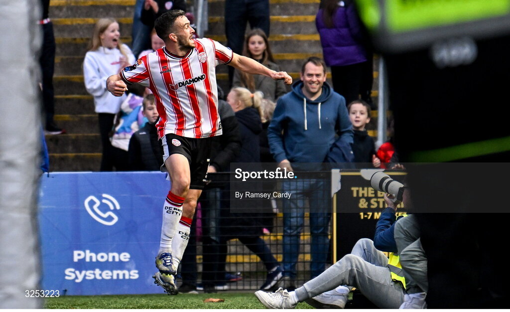 5 October 2025; Michael Duffy of Derry City celebrates after scoring his side's first goal during the SSE Airtricity Men's Premier Division match between Derry City and Sligo Rovers at The Ryan McBride Brandywell Stadium in Derry. Photo by Ramsey Cardy/Sportsfile