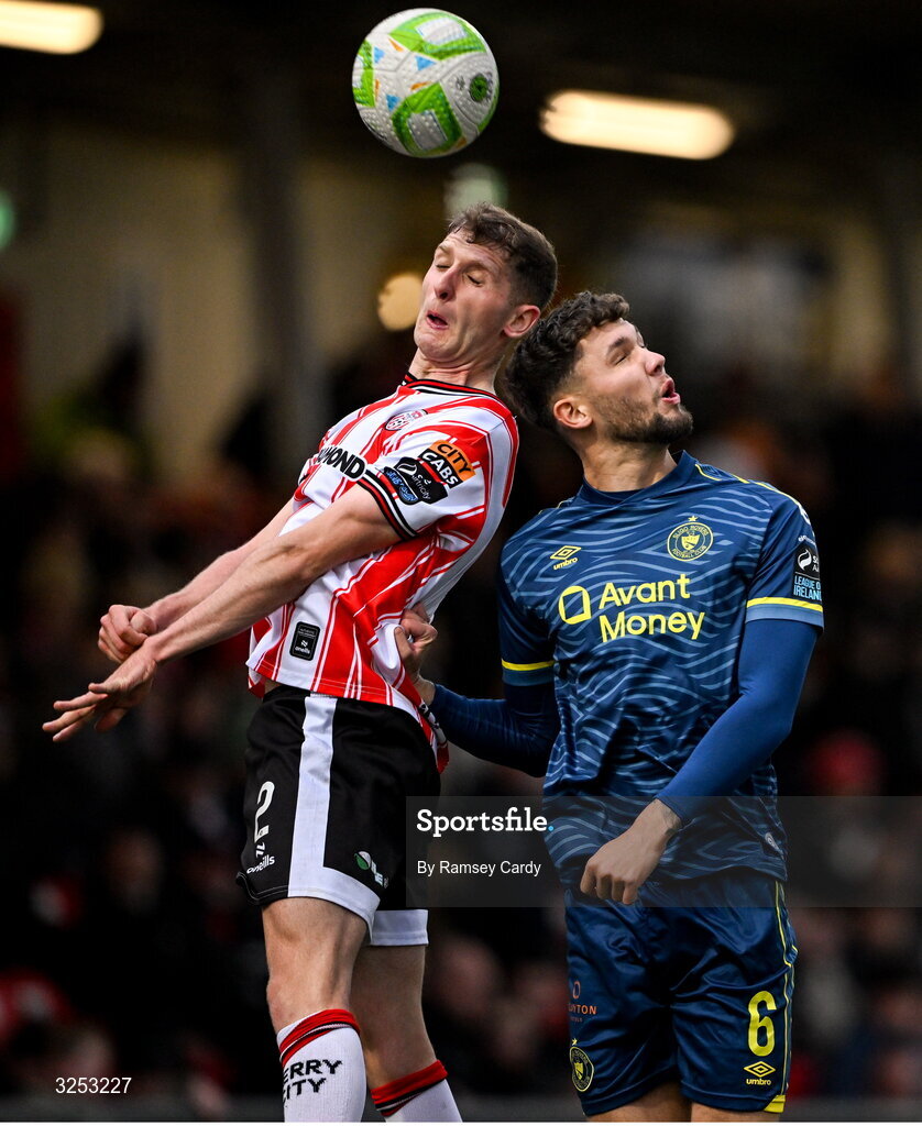 5 October 2025; Ronan Boyce of Derry City in action against Matty Wolfe of Sligo Rovers during the SSE Airtricity Men's Premier Division match between Derry City and Sligo Rovers at The Ryan McBride Brandywell Stadium in Derry. Photo by Ramsey Cardy/Sportsfile
