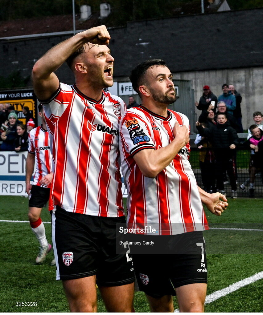 5 October 2025; Michael Duffy of Derry City celebrates with Jamie Stott, left, after scoring their side's first goal during the SSE Airtricity Men's Premier Division match between Derry City and Sligo Rovers at The Ryan McBride Brandywell Stadium in Derry. Photo by Ramsey Cardy/Sportsfile