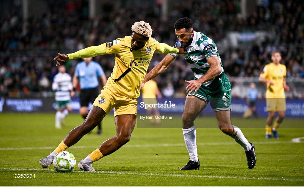 5 October 2025; Daniel Okwute of Kerry FC in action against Roberto Lopes of Shamrock Rovers during the Sports Direct Men’s FAI Cup semi-final match between Shamrock Rovers and Kerry FC at Tallaght Stadium in Dublin. Photo by Ben McShane/Sportsfile