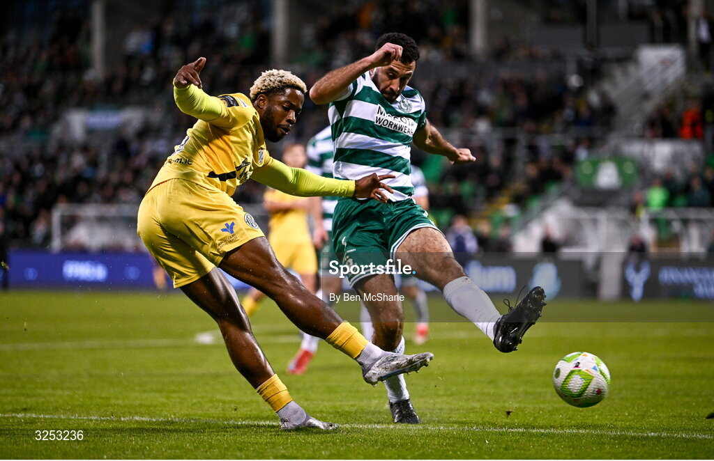 5 October 2025; Daniel Okwute of Kerry FC in action against Roberto Lopes of Shamrock Rovers during the Sports Direct Men’s FAI Cup semi-final match between Shamrock Rovers and Kerry FC at Tallaght Stadium in Dublin. Photo by Ben McShane/Sportsfile