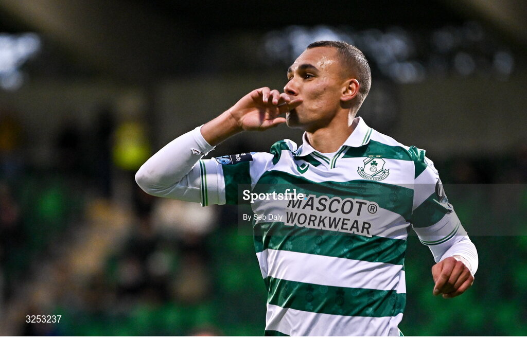 5 October 2025; Graham Burke of Shamrock Rovers celebrates after scoring his side's first goal during the Sports Direct Men’s FAI Cup semi-final match between Shamrock Rovers and Kerry FC at Tallaght Stadium in Dublin. Photo by Seb Daly/Sportsfile