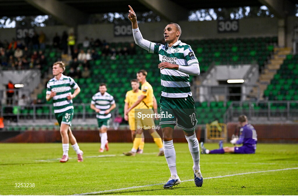 5 October 2025; Graham Burke of Shamrock Rovers celebrates after scoring his side's first goal during the Sports Direct Men’s FAI Cup semi-final match between Shamrock Rovers and Kerry FC at Tallaght Stadium in Dublin. Photo by Seb Daly/Sportsfile