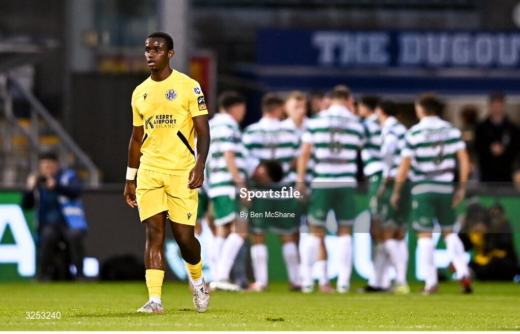 5 October 2025; Carl Mujaguzi of Kerry FC reacts after his side concede their first goal during the Sports Direct Men’s FAI Cup semi-final match between Shamrock Rovers and Kerry FC at Tallaght Stadium in Dublin. Photo by Ben McShane/Sportsfile