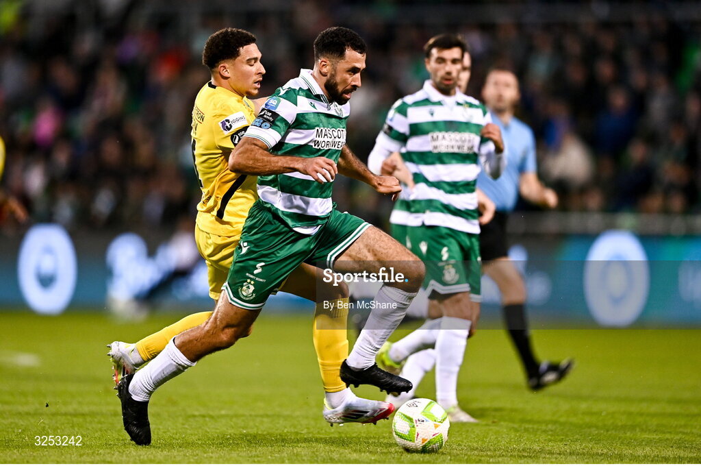5 October 2025; Roberto Lopes of Shamrock Rovers in action against Robbie Cleary of Kerry FC during the Sports Direct Men’s FAI Cup semi-final match between Shamrock Rovers and Kerry FC at Tallaght Stadium in Dublin. Photo by Ben McShane/Sportsfile