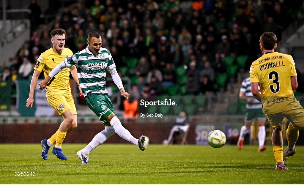 5 October 2025; Graham Burke of Shamrock Rovers scores his side's second goal during the Sports Direct Men’s FAI Cup semi-final match between Shamrock Rovers and Kerry FC at Tallaght Stadium in Dublin. Photo by Seb Daly/Sportsfile
