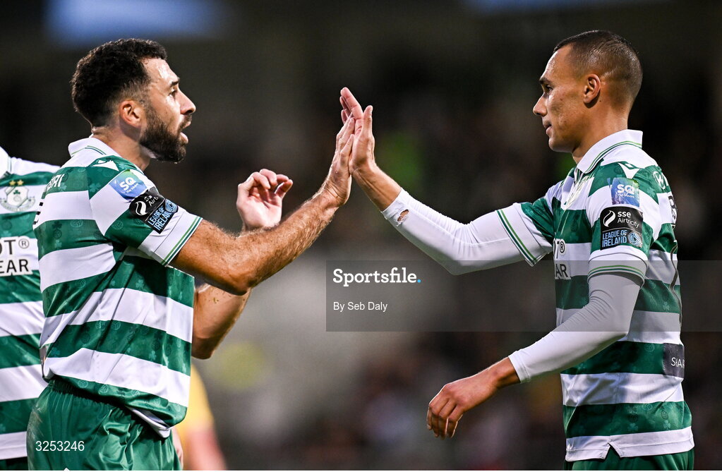 5 October 2025; Graham Burke of Shamrock Rovers, right, celebrates with teammate Roberto Lopes after scoring their side's second goal during the Sports Direct Men’s FAI Cup semi-final match between Shamrock Rovers and Kerry FC at Tallaght Stadium in Dublin. Photo by Seb Daly/Sportsfile