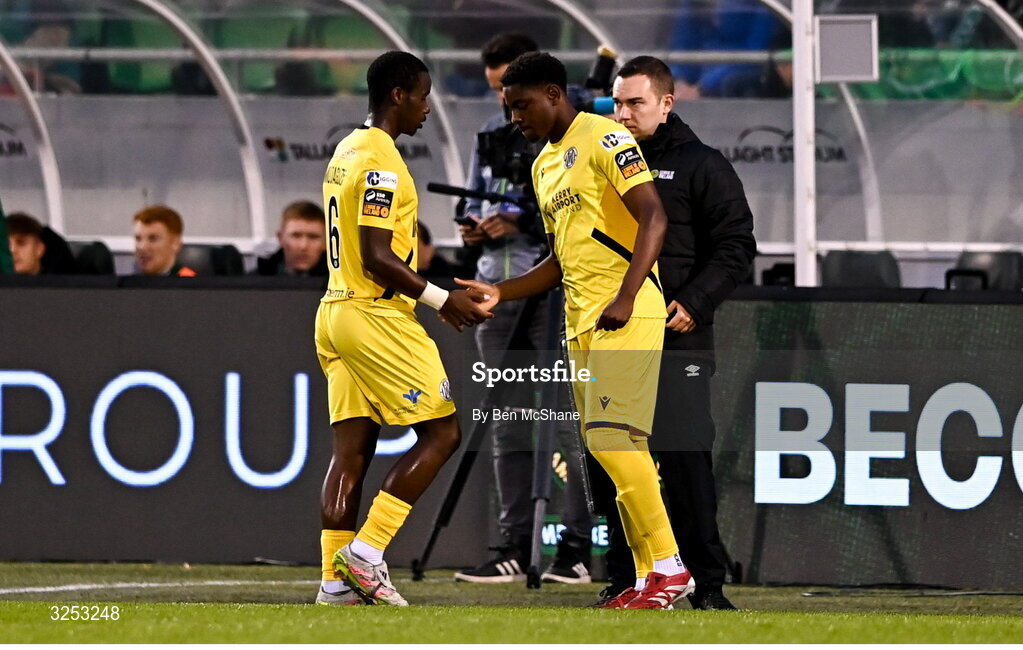 5 October 2025; Carl Mujaguzi of Kerry FC, left, is substituted off for teammate Samuel Aladesanusi, in the 29th minute, during the Sports Direct Men’s FAI Cup semi-final match between Shamrock Rovers and Kerry FC at Tallaght Stadium in Dublin. Photo by Ben McShane/Sportsfile