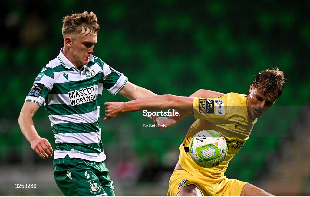 5 October 2025; Michael Noonan of Shamrock Rovers in action against Niall Brookwell of Kerry FC during the Sports Direct Men’s FAI Cup semi-final match between Shamrock Rovers and Kerry FC at Tallaght Stadium in Dublin. Photo by Seb Daly/Sportsfile