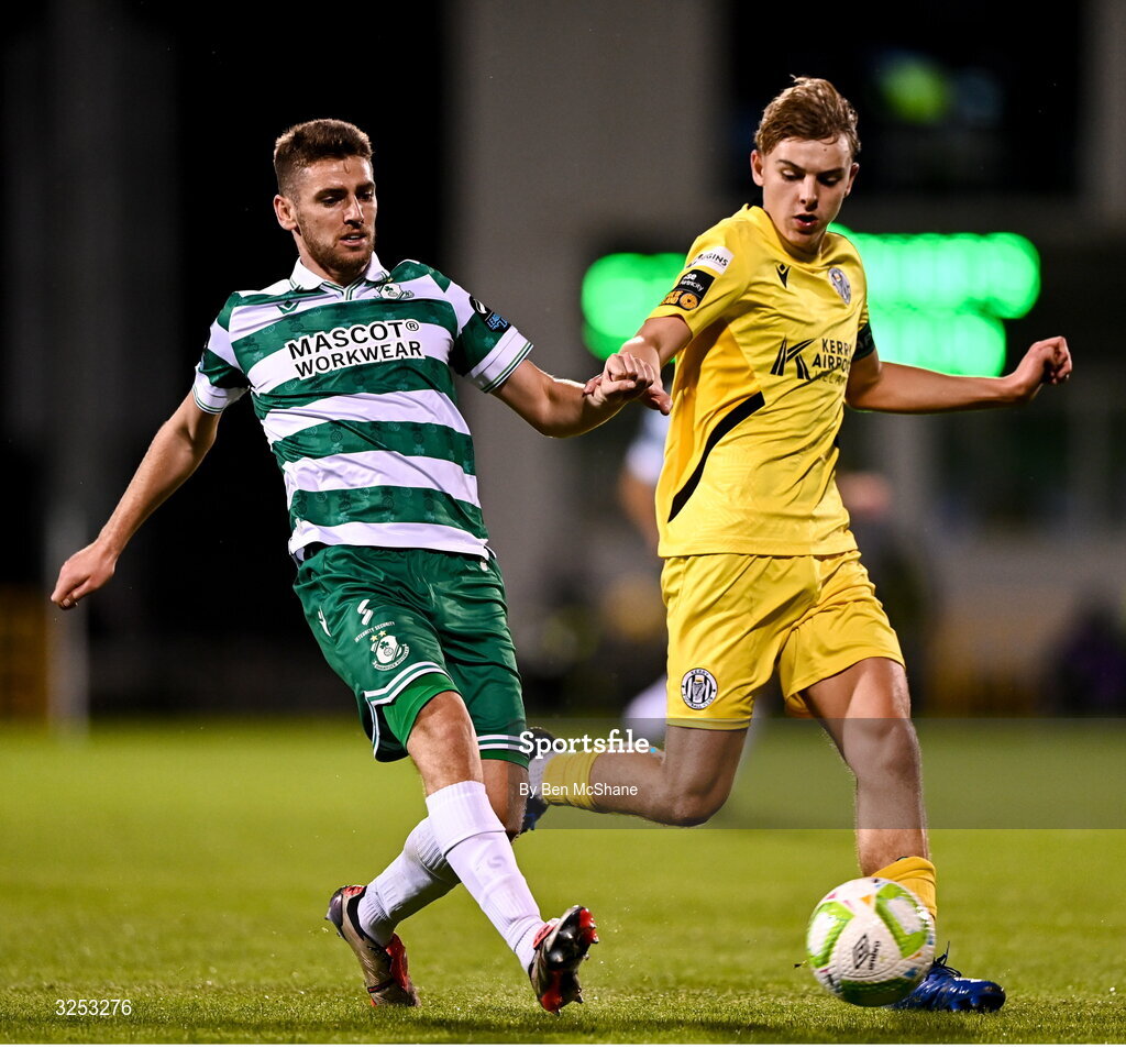 5 October 2025; Dylan Watts of Shamrock Rovers in action against Ronan Teahan of Kerry FC during the Sports Direct Men’s FAI Cup semi-final match between Shamrock Rovers and Kerry FC at Tallaght Stadium in Dublin. Photo by Ben McShane/Sportsfile