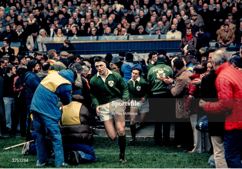 20 February 1982; Ireland captain Donal Lenihan leads his side onto the pitch before the Five Nations Rugby Championship match between Ireland and Scotland at Lansdowne Road. Photo by Ray McManus/Sportsfile