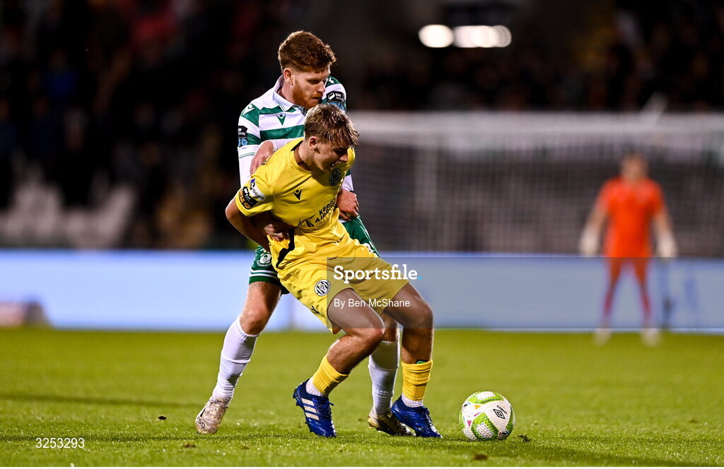 5 October 2025; Ronan Teahan of Kerry FC is tackled by Connor Malley of Shamrock Rovers during the Sports Direct Men’s FAI Cup semi-final match between Shamrock Rovers and Kerry FC at Tallaght Stadium in Dublin. Photo by Ben McShane/Sportsfile