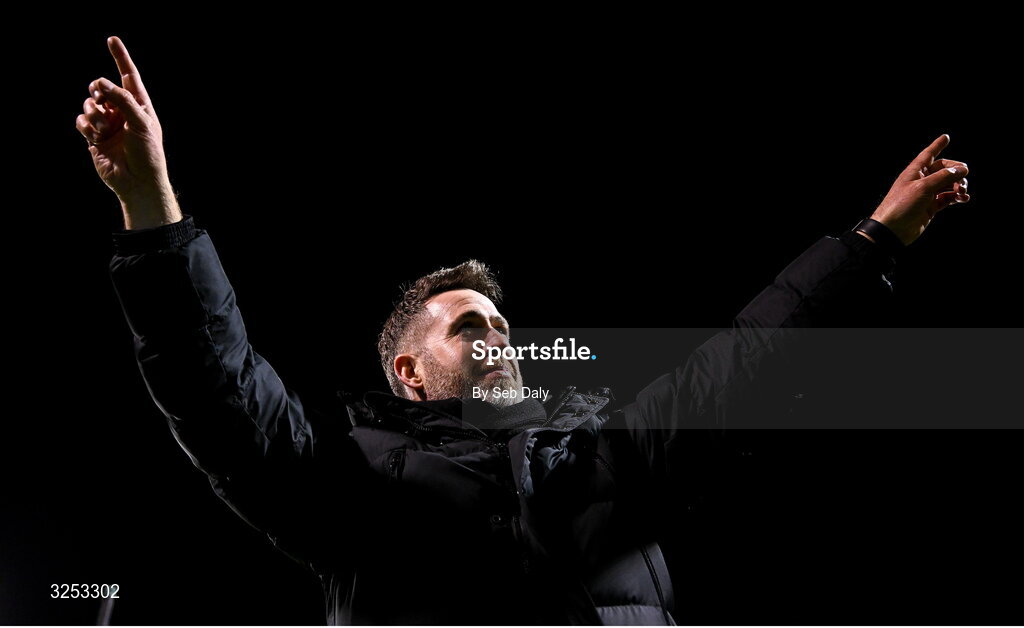 5 October 2025; Shamrock Rovers manager Stephen Bradley celebrates after his side's victory in the Sports Direct Men’s FAI Cup semi-final match between Shamrock Rovers and Kerry FC at Tallaght Stadium in Dublin. Photo by Seb Daly/Sportsfile