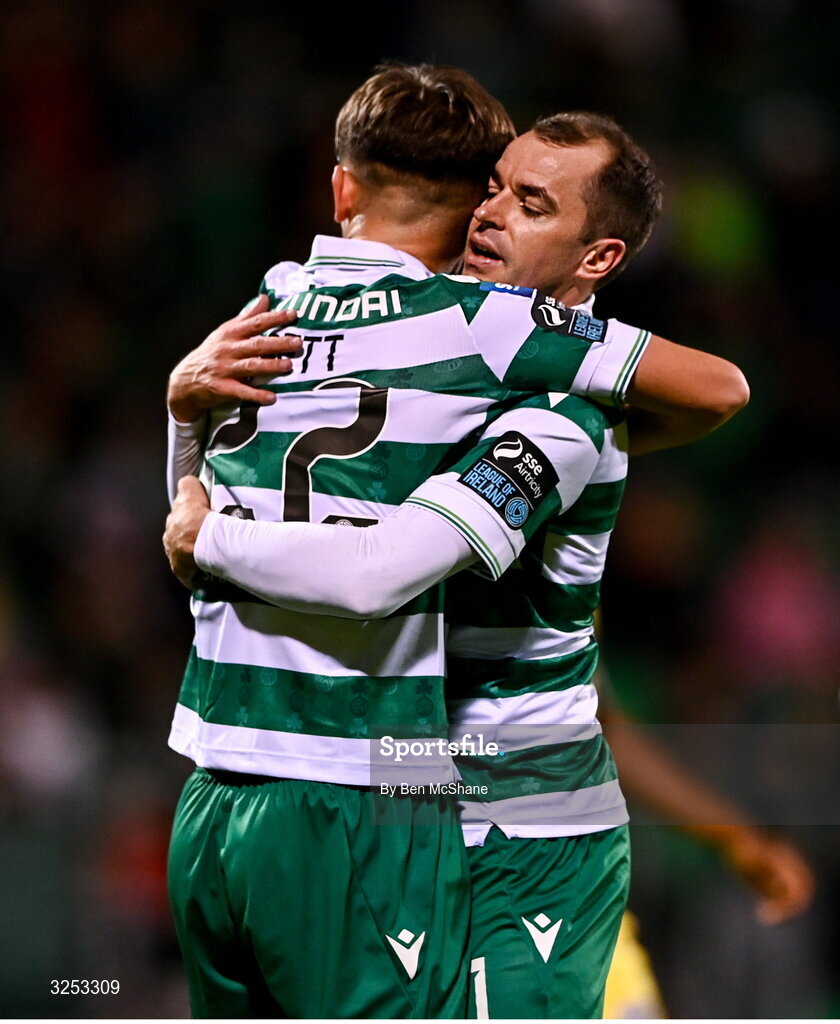 5 October 2025; Cian Barrett of Shamrock Rovers celebrates with Sean Kavanagh, right, after scoring their side's sixth goal during the Sports Direct Men’s FAI Cup semi-final match between Shamrock Rovers and Kerry FC at Tallaght Stadium in Dublin. Photo by Ben McShane/Sportsfile