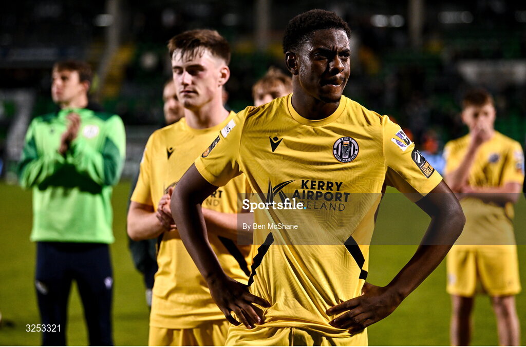 5 October 2025; Samuel Aladesanusi of Kerry FC reacts after his side's defeat in the Sports Direct Men’s FAI Cup semi-final match between Shamrock Rovers and Kerry FC at Tallaght Stadium in Dublin. Photo by Ben McShane/Sportsfile