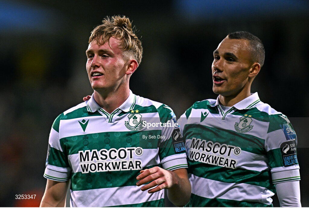 5 October 2025; Michael Noonan of Shamrock Rovers, left, celebrates with teammate Graham Burke after scoring their side's third goal during the Sports Direct Men’s FAI Cup semi-final match between Shamrock Rovers and Kerry FC at Tallaght Stadium in Dublin. Photo by Seb Daly/Sportsfile
