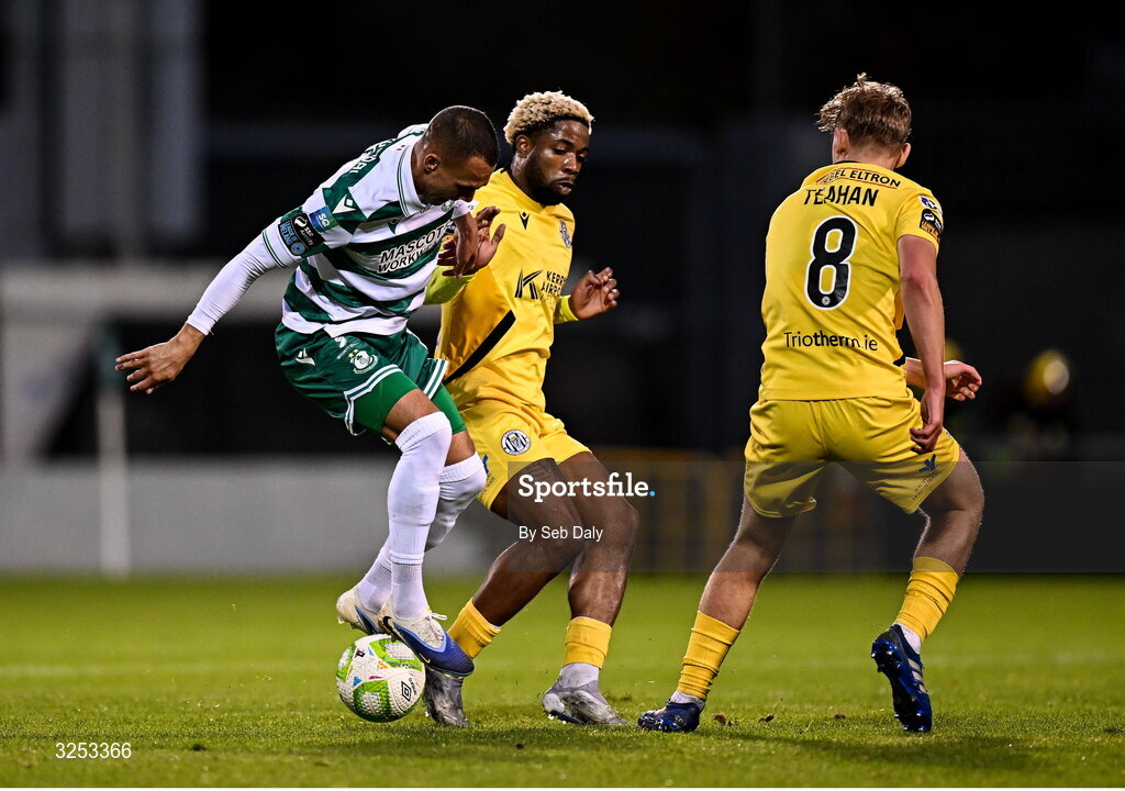 5 October 2025; Graham Burke of Shamrock Rovers in action against Kerry FC players Daniel Okwute, behind, and Ronan Teahan, right, during the Sports Direct Men’s FAI Cup semi-final match between Shamrock Rovers and Kerry FC at Tallaght Stadium in Dublin. Photo by Seb Daly/Sportsfile