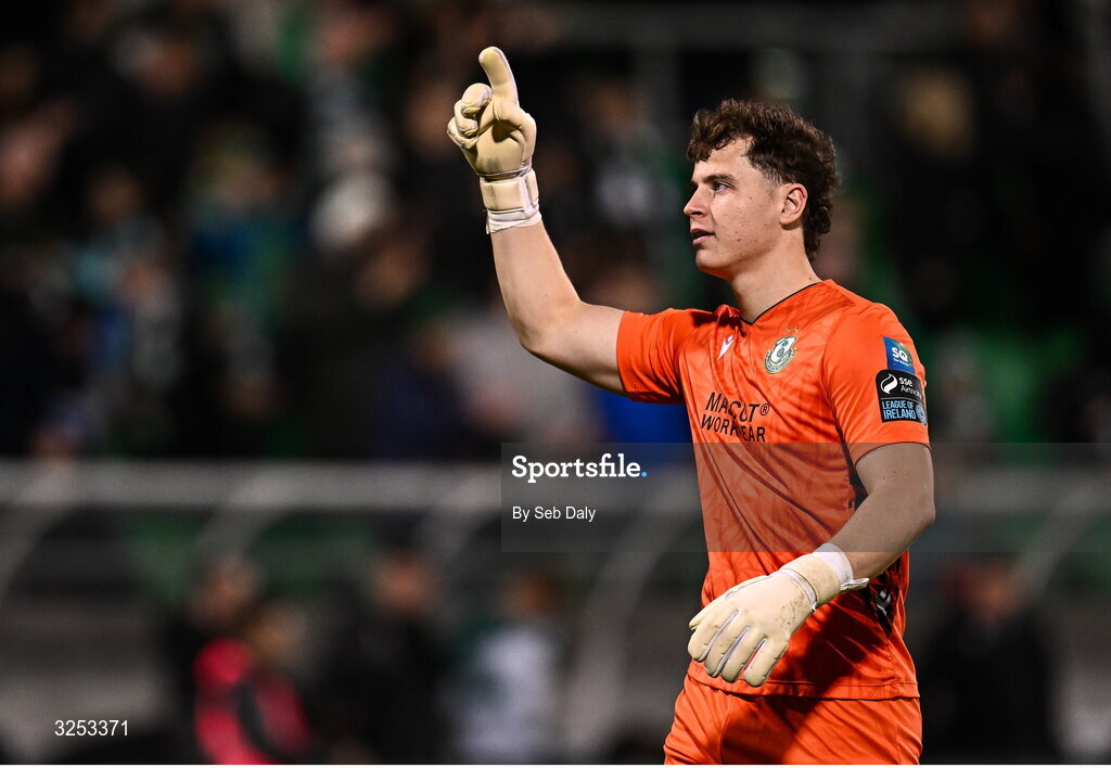 5 October 2025; Shamrock Rovers goalkeeper Ed McGinty celebrates after his side's victory in the Sports Direct Men’s FAI Cup semi-final match between Shamrock Rovers and Kerry FC at Tallaght Stadium in Dublin. Photo by Seb Daly/Sportsfile