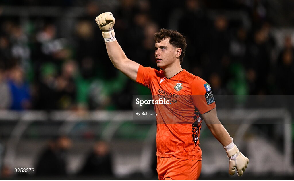 5 October 2025; Shamrock Rovers goalkeeper Ed McGinty celebrates after his side's victory in the Sports Direct Men’s FAI Cup semi-final match between Shamrock Rovers and Kerry FC at Tallaght Stadium in Dublin. Photo by Seb Daly/Sportsfile