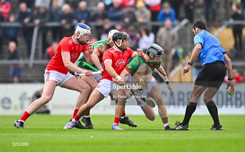 5 October 2025; Éire Óg Ennis players Oran Cahill, left, and David Reidy and Clooney Quin players Ryan Taylor, behind, and Jimmy Corry battle for position as referee John Bugler prepares to throw the ball to to start the Clare County Senior Club Hurling Championship final match between Clooney Quin and Éire Óg Ennis at Zimmer Biomet Páirc Chíosóg in Ennis, Clare. Photo by Piaras Ó Mídheach/Sportsfile
