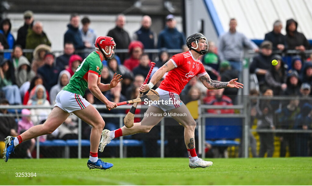 5 October 2025; Aaron Fitzgerald of Éire Óg Ennis in action against Darragh McNamara of Clooney Quin during the Clare County Senior Club Hurling Championship final match between Clooney Quin and Éire Óg Ennis at Zimmer Biomet Páirc Chíosóg in Ennis, Clare. Photo by Piaras Ó Mídheach/Sportsfile