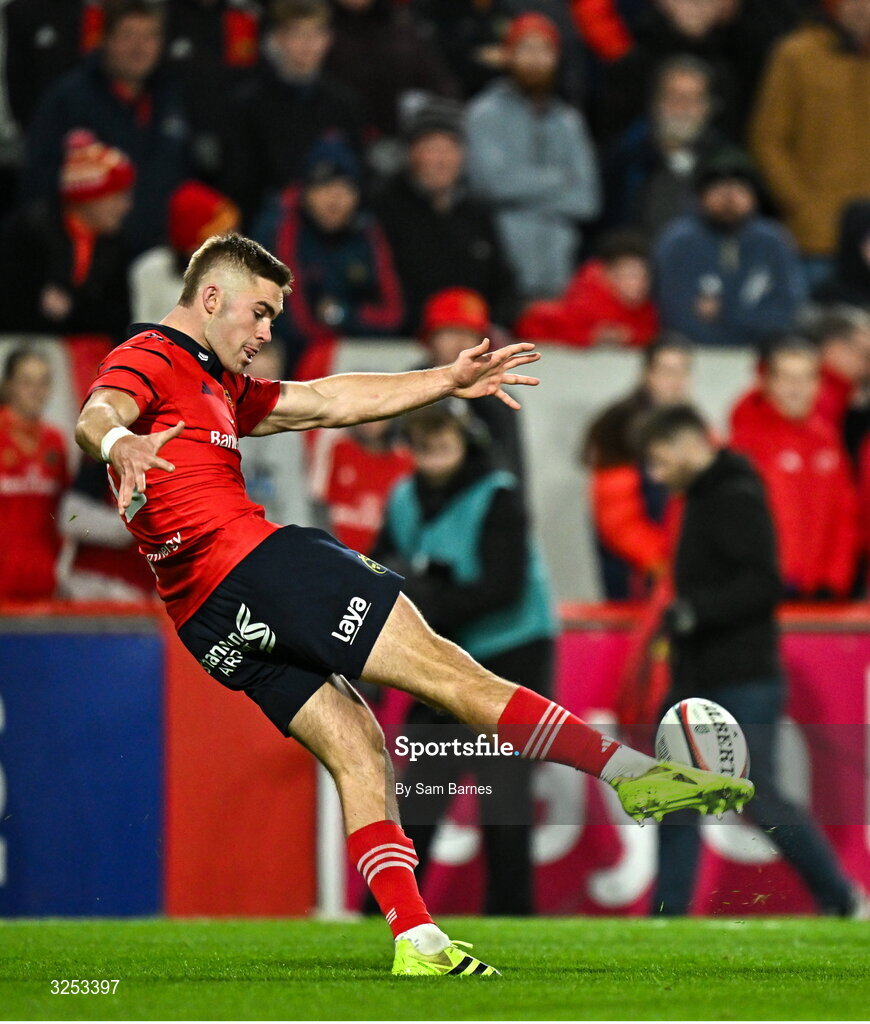 4 October 2025; Jack Crowley of Munster during the United Rugby Championship match between Munster and Cardiff Rugby at Thomond Park in Limerick. Photo by Sam Barnes/Sportsfile