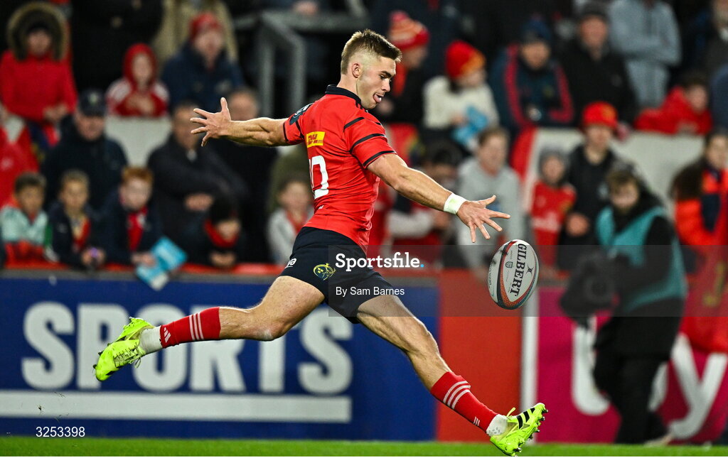 4 October 2025; Jack Crowley of Munster during the United Rugby Championship match between Munster and Cardiff Rugby at Thomond Park in Limerick. Photo by Sam Barnes/Sportsfile