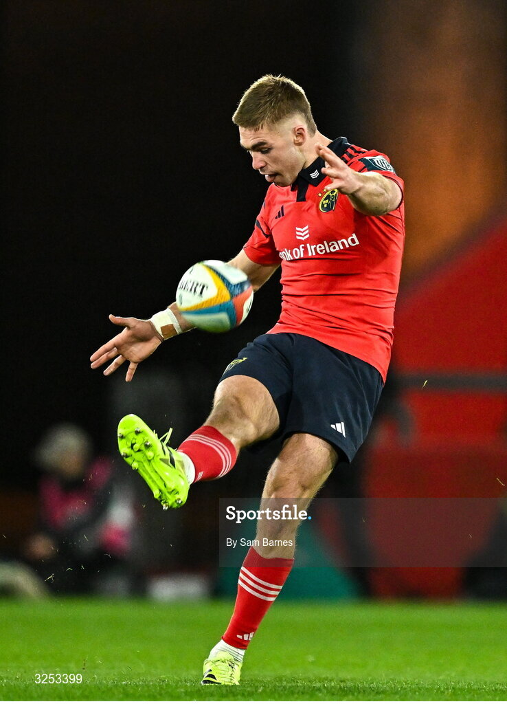 4 October 2025; Jack Crowley of Munster during the United Rugby Championship match between Munster and Cardiff Rugby at Thomond Park in Limerick. Photo by Sam Barnes/Sportsfile