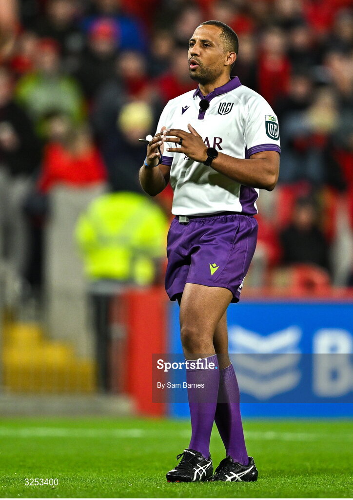 4 October 2025; Referee Griffin Colby during the United Rugby Championship match between Munster and Cardiff Rugby at Thomond Park in Limerick. Photo by Sam Barnes/Sportsfile