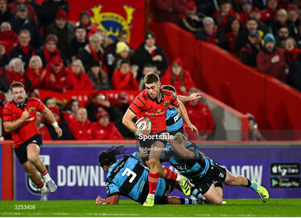 4 October 2025; Jack Crowley of Munster is tackled by Johan Mulder of Cardiff Rugby during the United Rugby Championship match between Munster and Cardiff Rugby at Thomond Park in Limerick. Photo by Sam Barnes/Sportsfile