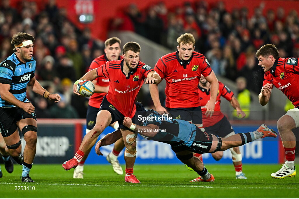 4 October 2025; Alex Nankivell of Munster is tackled by Alun Lawrence of Cardiff Rugby during the United Rugby Championship match between Munster and Cardiff Rugby at Thomond Park in Limerick. Photo by Sam Barnes/Sportsfile
