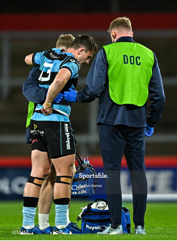 4 October 2025; Harri Millard of Cardiff Rugby receives medical attention during the United Rugby Championship match between Munster and Cardiff Rugby at Thomond Park in Limerick. Photo by Sam Barnes/Sportsfile