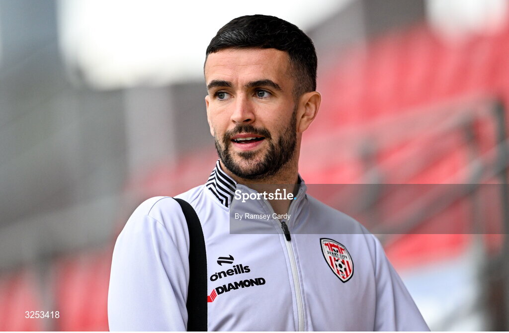 5 October 2025; Michael Duffy of Derry City before the SSE Airtricity Men's Premier Division match between Derry City and Sligo Rovers at The Ryan McBride Brandywell Stadium in Derry. Photo by Ramsey Cardy/Sportsfile