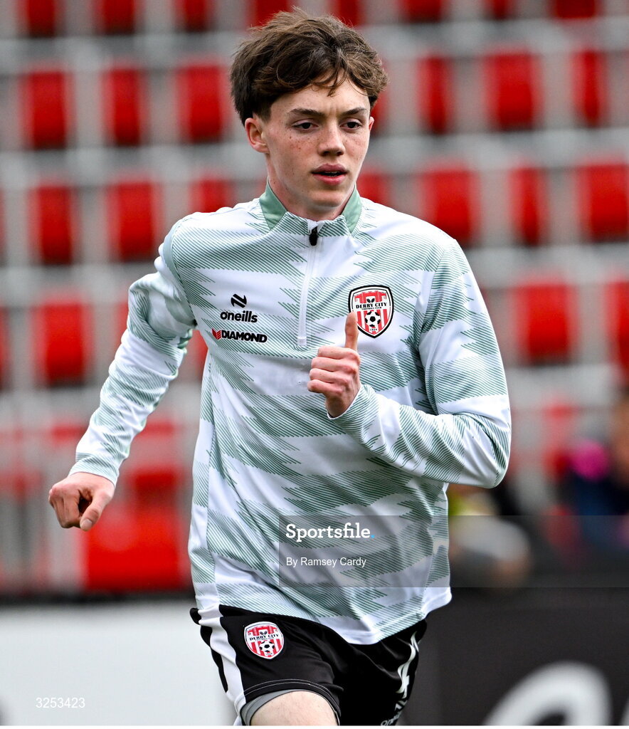 5 October 2025; Callum Downey of Derry City before the SSE Airtricity Men's Premier Division match between Derry City and Sligo Rovers at The Ryan McBride Brandywell Stadium in Derry. Photo by Ramsey Cardy/Sportsfile