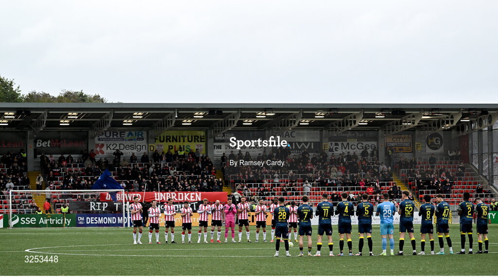 5 October 2025; Both team stand for a minute's applause before the SSE Airtricity Men's Premier Division match between Derry City and Sligo Rovers at The Ryan McBride Brandywell Stadium in Derry. Photo by Ramsey Cardy/Sportsfile