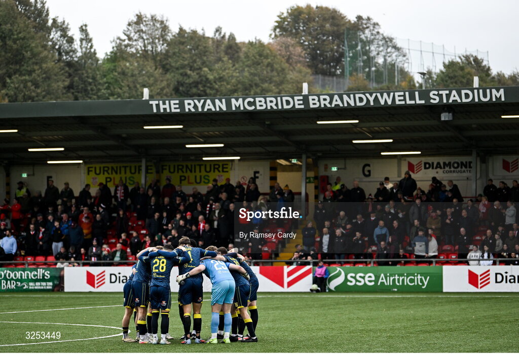 5 October 2025; The Sligo Rovers team huddle before the SSE Airtricity Men's Premier Division match between Derry City and Sligo Rovers at The Ryan McBride Brandywell Stadium in Derry. Photo by Ramsey Cardy/Sportsfile