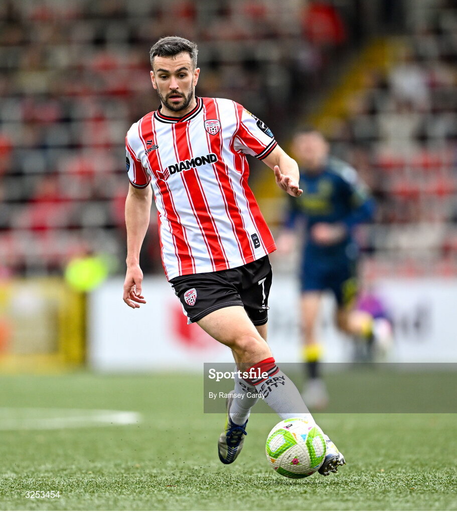 5 October 2025; Michael Duffy of Derry City during the SSE Airtricity Men's Premier Division match between Derry City and Sligo Rovers at The Ryan McBride Brandywell Stadium in Derry. Photo by Ramsey Cardy/Sportsfile