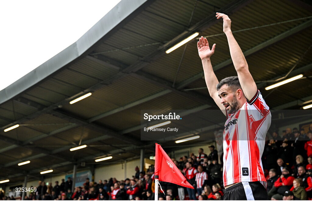5 October 2025; Michael Duffy of Derry City during the SSE Airtricity Men's Premier Division match between Derry City and Sligo Rovers at The Ryan McBride Brandywell Stadium in Derry. Photo by Ramsey Cardy/Sportsfile