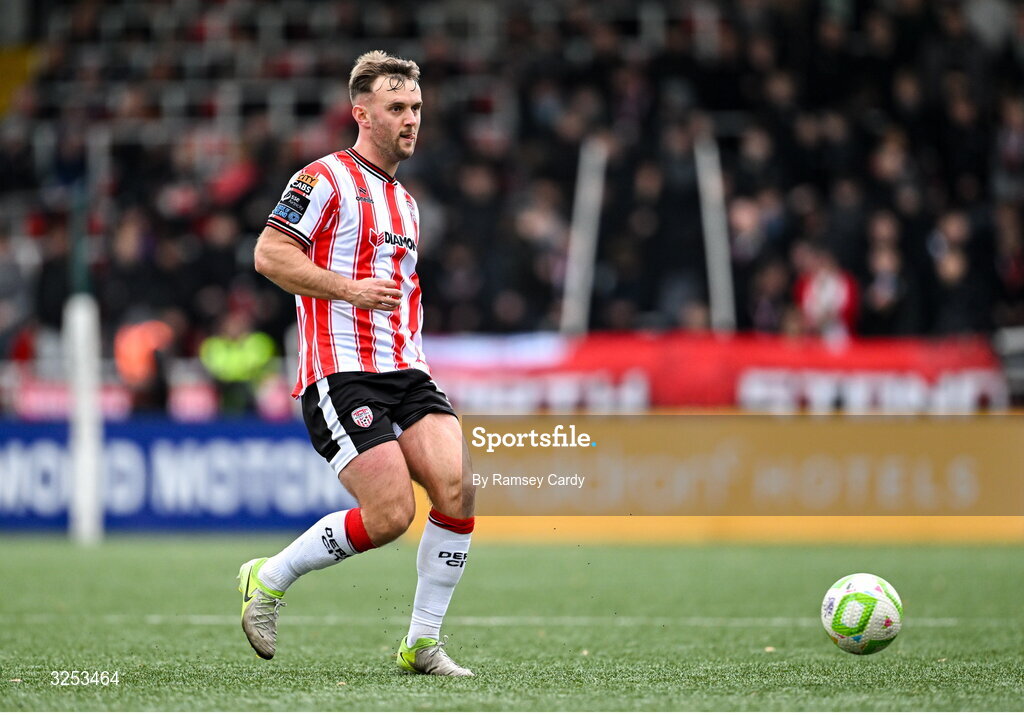 5 October 2025; Jamie Stott of Derry City during the SSE Airtricity Men's Premier Division match between Derry City and Sligo Rovers at The Ryan McBride Brandywell Stadium in Derry. Photo by Ramsey Cardy/Sportsfile