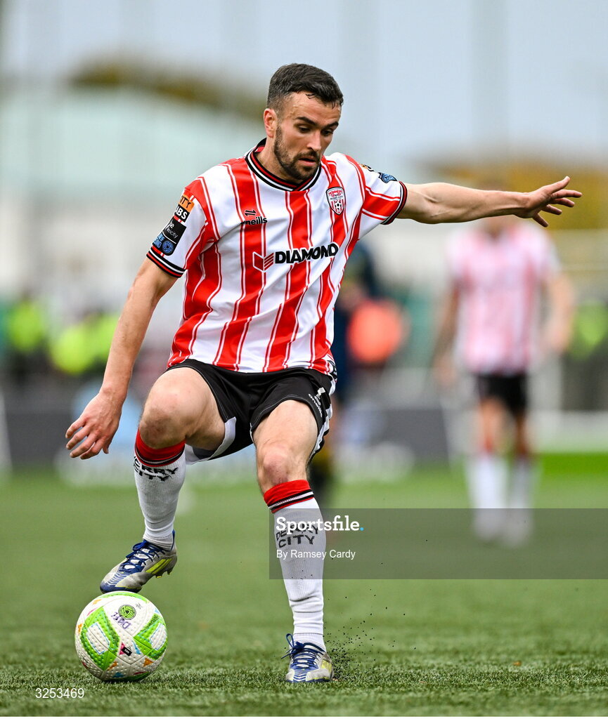 5 October 2025; Michael Duffy of Derry City during the SSE Airtricity Men's Premier Division match between Derry City and Sligo Rovers at The Ryan McBride Brandywell Stadium in Derry. Photo by Ramsey Cardy/Sportsfile