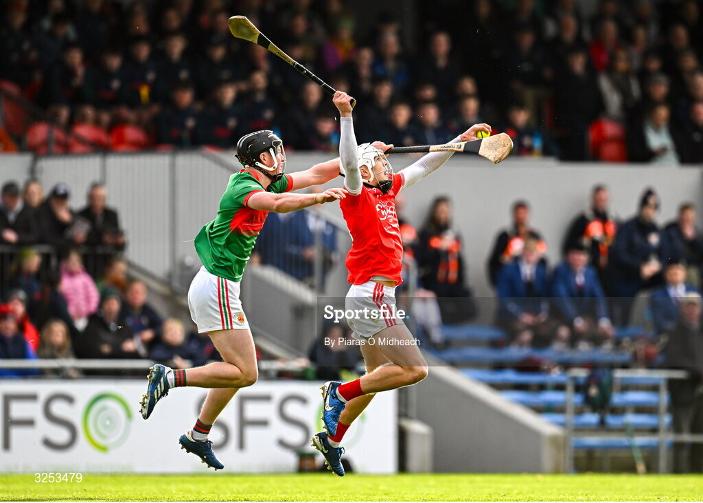 5 October 2025; Marco Cleary of Éire Óg Ennis in action against Sean McNamara of Clooney Quin during the Clare County Senior Club Hurling Championship final match between Clooney Quin and Éire Óg Ennis at Zimmer Biomet Páirc Chíosóg in Ennis, Clare. Photo by Piaras Ó Mídheach/Sportsfile