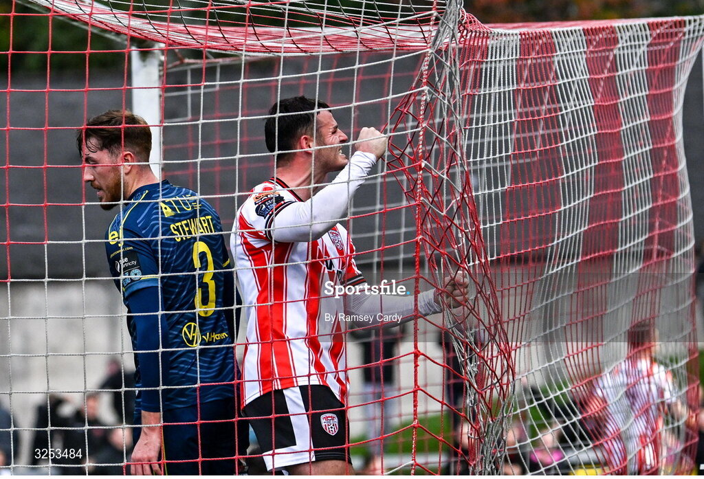 5 October 2025; Danny Mullen of Derry City celebrates his side's first goal, scored by Michael Duffy, during the SSE Airtricity Men's Premier Division match between Derry City and Sligo Rovers at The Ryan McBride Brandywell Stadium in Derry. Photo by Ramsey Cardy/Sportsfile