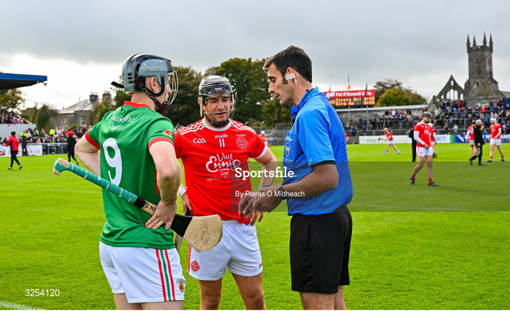 5 October 2025; Referee John Bugler with team captains Jim Corry of Clooney Quin, left, and David Reidy of Éire Óg Ennis before the Clare County Senior Club Hurling Championship final match between Clooney Quin and Éire Óg Ennis at Zimmer Biomet Páirc Chíosóg in Ennis, Clare. Photo by Piaras Ó Mídheach/Sportsfile