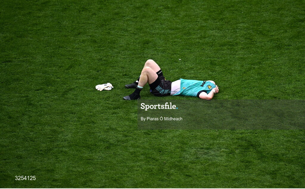 27 July 2025; Donegal goalkeeper Shaun Patton dejected after his side's defeat in the GAA Football All-Ireland Senior Championship final match between Kerry and Donegal at Croke Park in Dublin. Photo by Piaras Ó Mídheach/Sportsfile