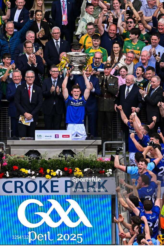 27 July 2025; Kerry captain Gavin White lifts the Sam Maguire Cup after his side's victory in the GAA Football All-Ireland Senior Championship final match between Kerry and Donegal at Croke Park in Dublin. Photo by Piaras Ó Mídheach/Sportsfile