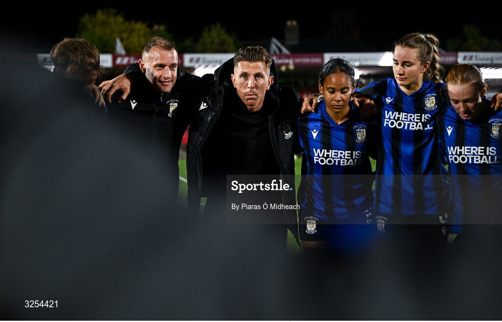 1 October 2025; Athlone Town head coach John Sullivan speaking in a huddle after the SSE Airtricity Women's Premier Division match between Cork City and Athlone Town at Turner's Cross in Cork. Photo by Piaras Ó Mídheach/Sportsfile