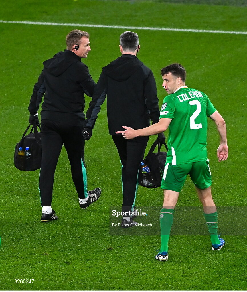 14 October 2025; Seamus Coleman of Republic of Ireland leaves the pitch to receive medical attention during the FIFA World Cup 2026 Group F qualifying match between Republic of Ireland and Armenia at the Aviva Stadium in Dublin. Photo by Piaras Ó Mídheach/Sportsfile