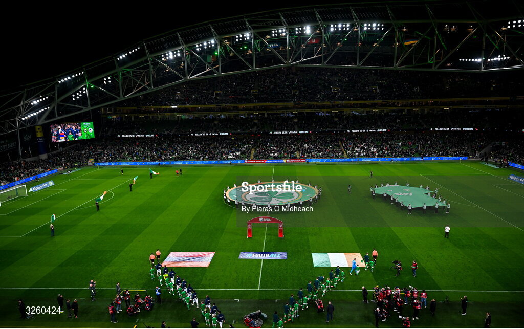 14 October 2025; Players make their way onto the pitch ahead of the FIFA World Cup 2026 Group F qualifying match between Republic of Ireland and Armenia at the Aviva Stadium in Dublin. Photo by Piaras Ó Mídheach/Sportsfile