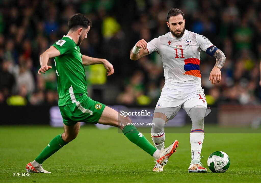 14 October 2025; Tigran Barseghyan of Armenia in action against Finn Azaz of Republic of Ireland during the FIFA World Cup 2026 Group F qualifying match between Republic of Ireland and Armenia at the Aviva Stadium in Dublin. Photo by Stephen McCarthy/Sportsfile