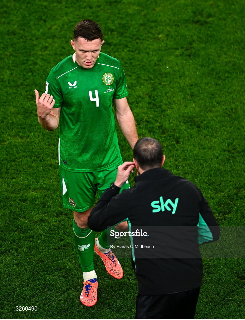 14 October 2025; Dara O'Shea of Republic of Ireland speaks with Republic of Ireland assistant head coach John O'Shea during the FIFA World Cup 2026 Group F qualifying match between Republic of Ireland and Armenia at the Aviva Stadium in Dublin. Photo by Piaras Ó Mídheach/Sportsfile